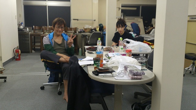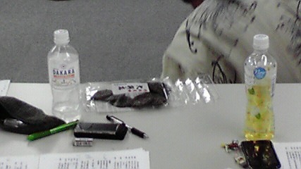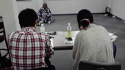 真剣に稽古を見守って下さっているスタッフお二人の後ろ姿と、そのテーブルの上には…、稽古場で大人気!!いつもの胡麻煎餅…(これ、ホントに美味しいですよ〓)の写真を添えさせて頂きました。